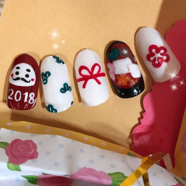 冬 お正月 ハンド キャラクター ミディアム スパングルのネイルデザイン No ネイルブック お正月ネイル ネイルデザイン 和風ネイル